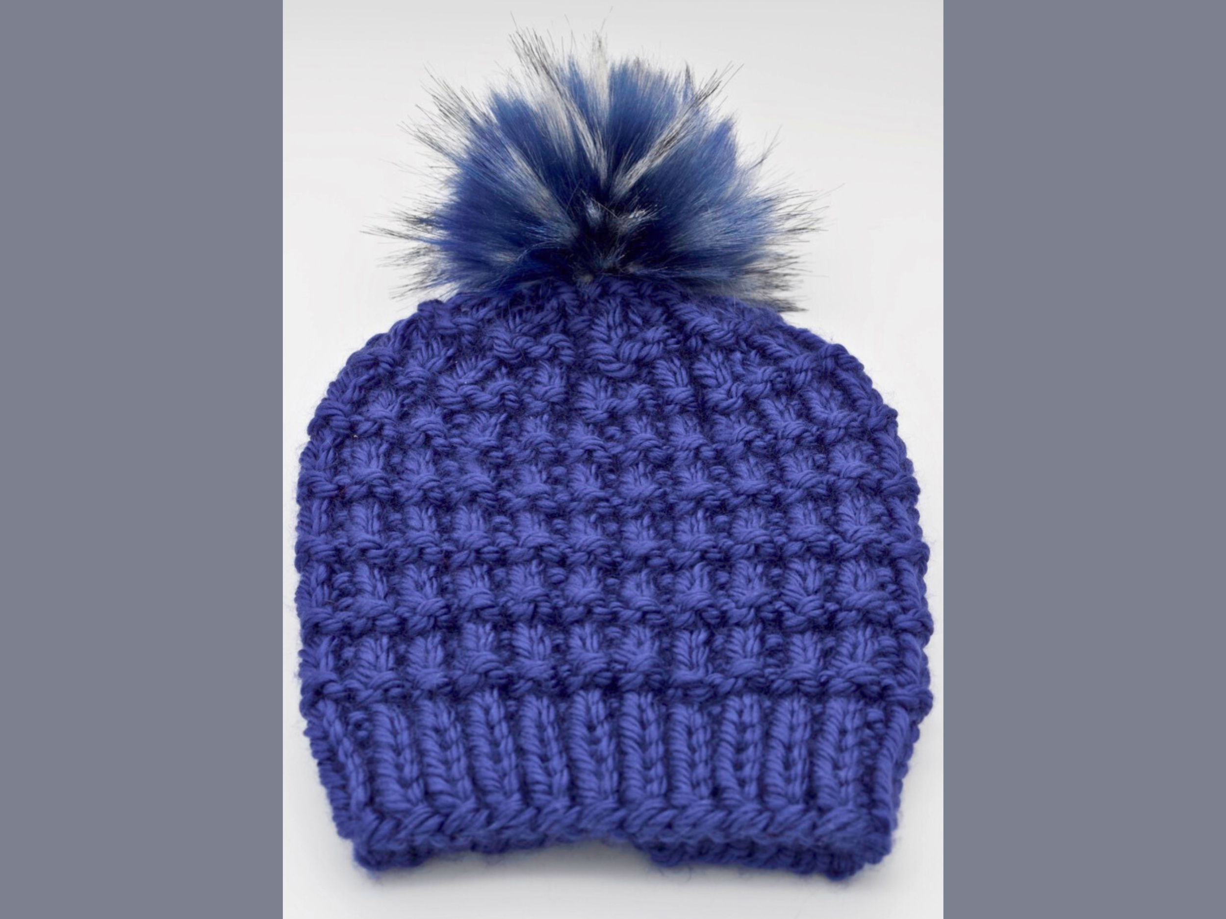 Hand-knit and assembled after months of perfecting my own version of the pattern, this hat is made with a solid navy blue super-bulky yarn. Topped by a handmade (by Life's Little Things in CO; removable) pom in dark / light blues, and white striped throughout, complementing the textured pattern perfectly. This hat is the perfect accessory for anyone in colder weather wanting a soft, comfy, plush hat.